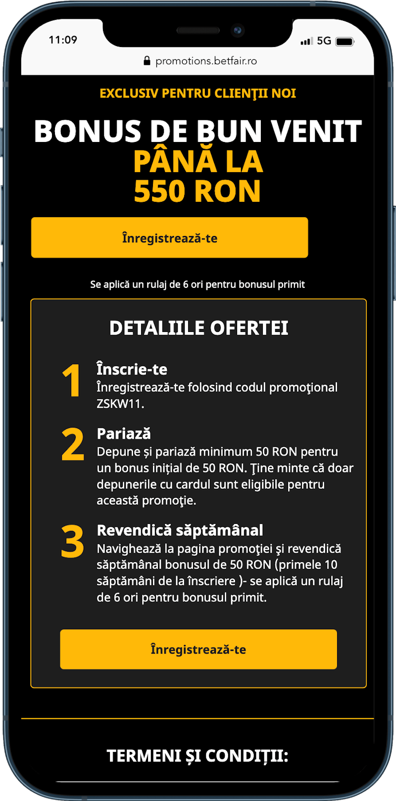 În primele 10 săptămâni după înregistrare vei fi eligibil pentru o altă promoție similară de 50 RON în fiecare săptămână.
