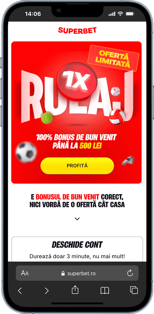 Îți deschizi cont și accepți bonusul de bun venit. Faci un depozit (minim 20 lei) și primești bonus pentru: