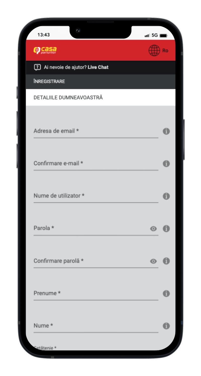 → Introduci o parolă - între 8-20 caractere, obligatoriu o majusculă, o cifră și o literă mică (diferită de numele de utilizator)