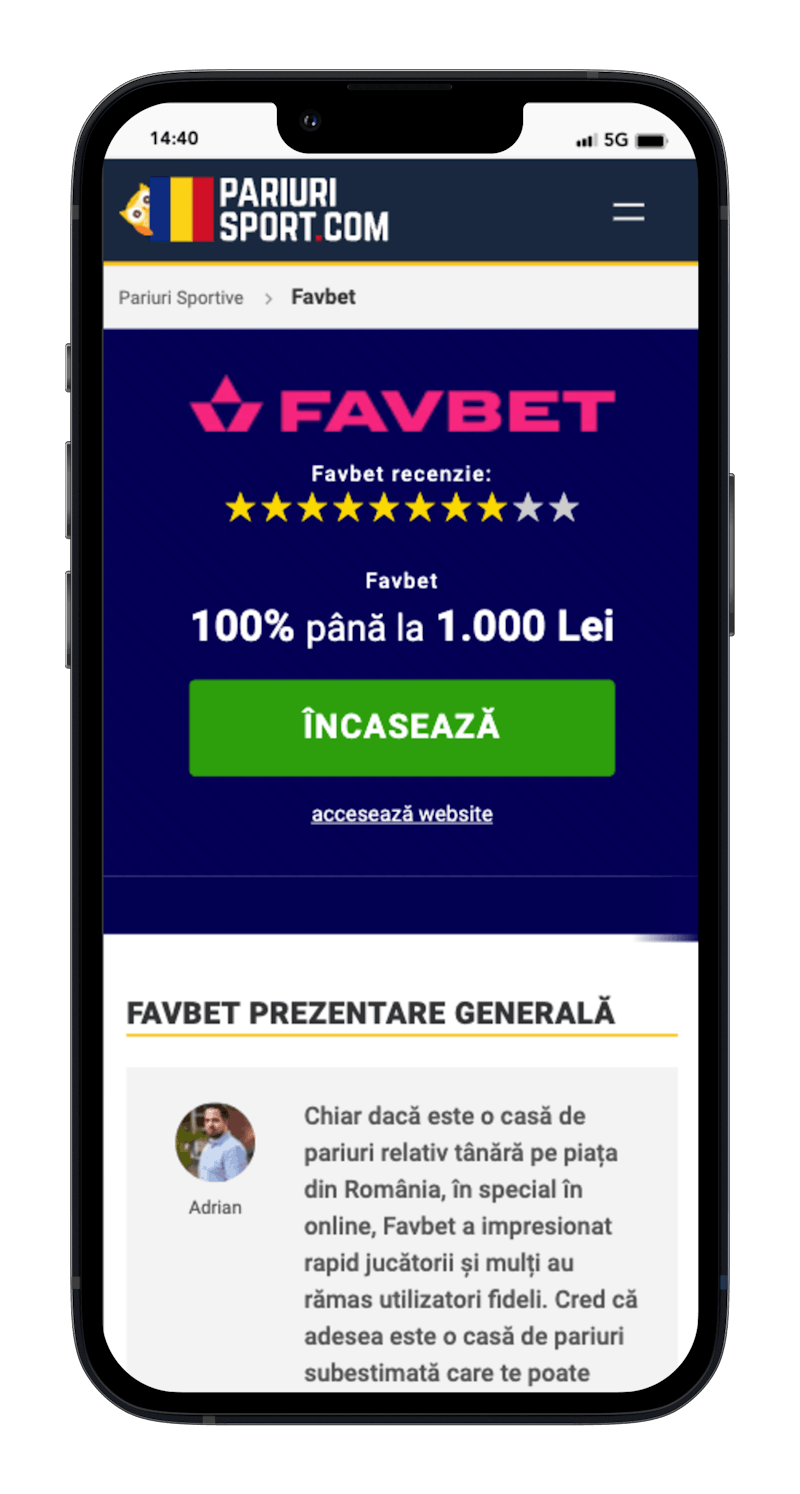 Asta înseamnă că Favbet oferă în general cote mai bune decât unele case de pariuri recunoscute pentru calitatea cotelor, cum ar fi Betano, Superbet, sau Casa Pariurilor.
