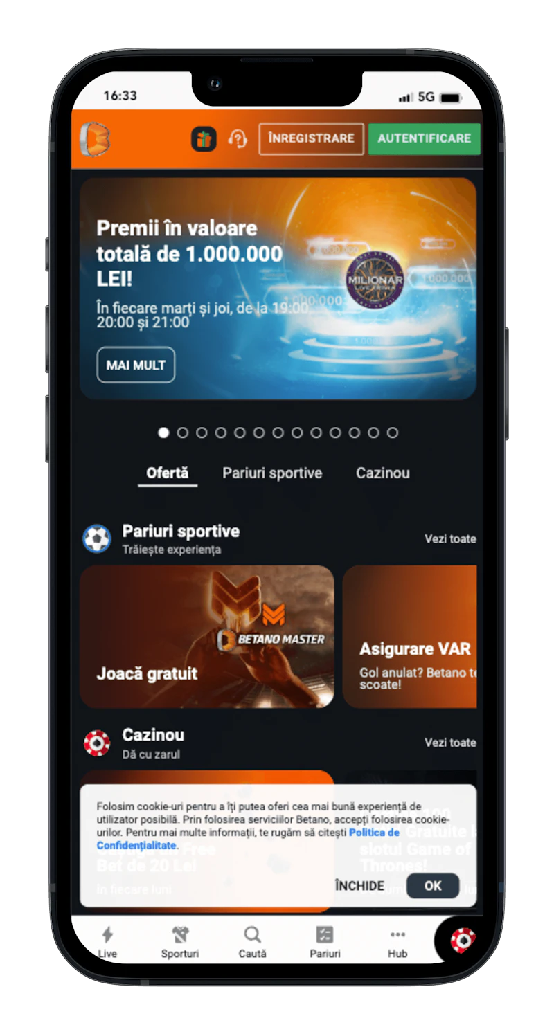 Parcurgi procesul de înregistrare (3-5 minute), completezi verificarea și ești gata de pariuri.