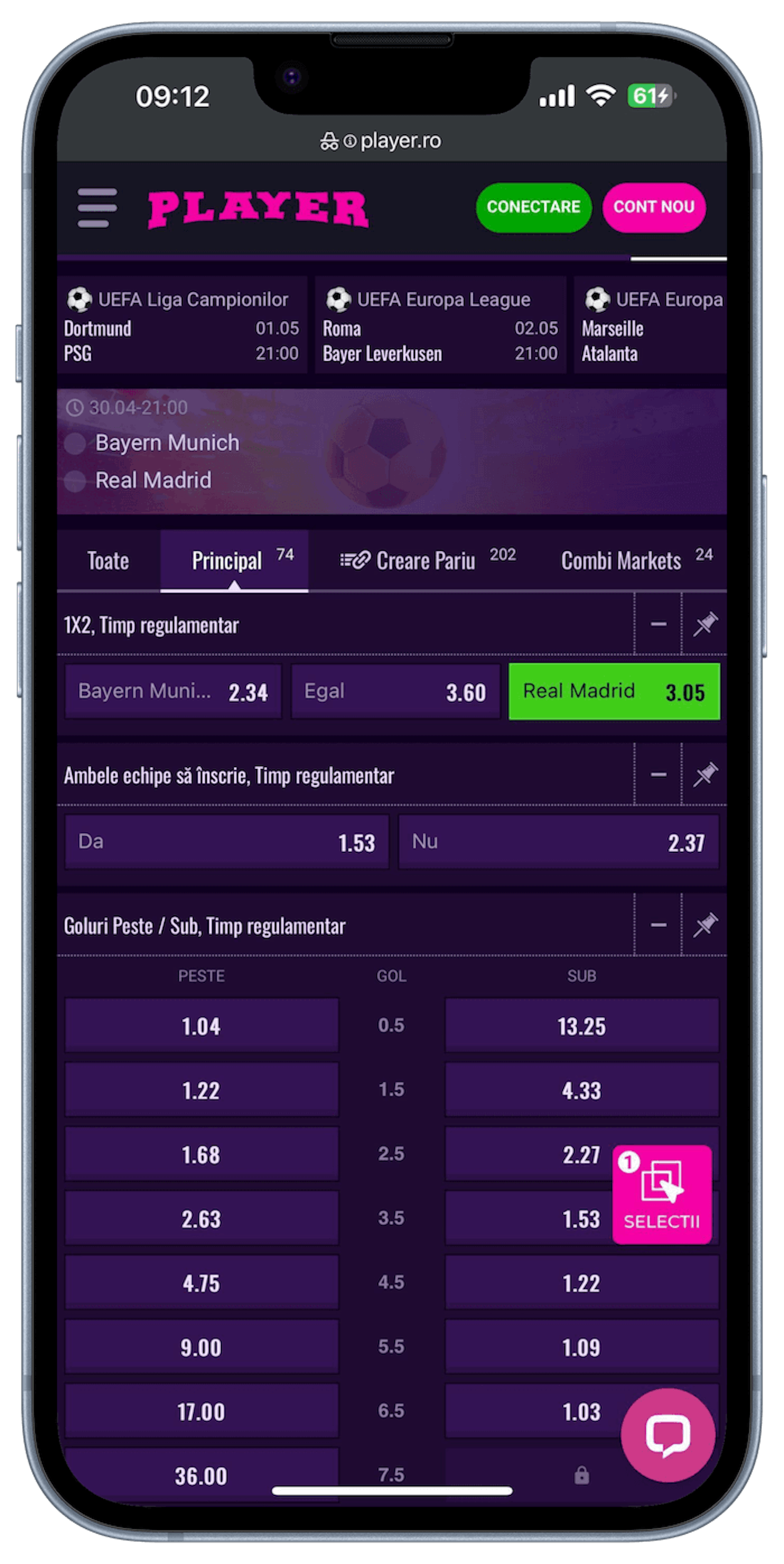 Player este una dintre puținele case de pariuri unde identitatea vizuală este distinctă. O temă întunecată (preferatele mele) cu multe nuanțe de mov, roz, funcționează excelent împreună. Designul Player este un fel de “copil” al site-urilor Mr Bit și Favbet, două dintre cele mai moderne pe care le vei găsi active la noi în țară.